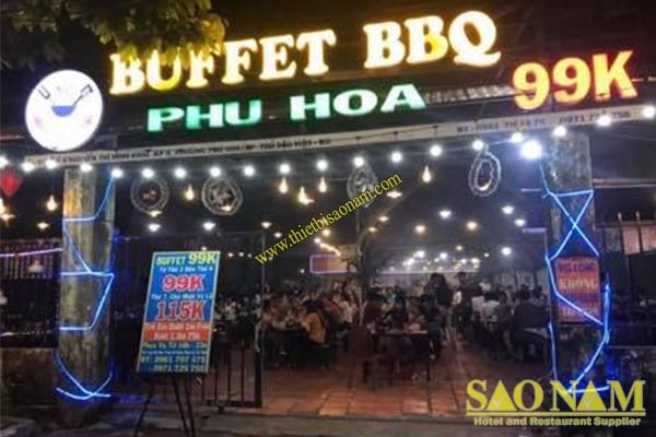 Giới trẻ Bình Dương lại được thêm dịp ăn thoải mái bởi sự xuất hiện của quán Buffet 99k – Phú Hòa. Bởi món ăn ở đây không chỉ ngon, đậm vị mà giá chỉ có 99.000 đồng/ người thôi. Không gian quán thoáng mát, rộng rãi thích hợp để nhâm nhi các món nướng và trò chuyện. Ngoài không gian trong nhà thì quán cũng có cả không gian ngoài trời nên bạn có thể thoải mái chọn lựa chỗ ngồi.