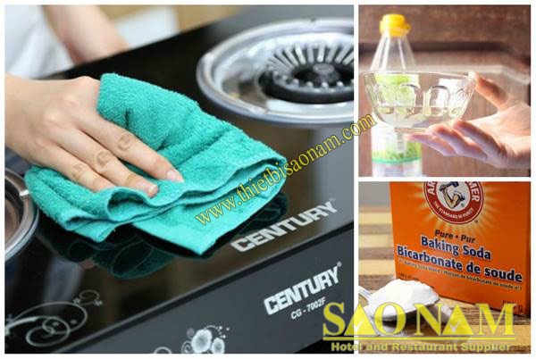 Bước 3: Vệ sinh bề mặt bếp gas bằng cách dùng nước cơm hoặc nước chanh + baking soda lau 1 lượt cho hút hết dầu mỡ. Sau đó lau lại bằng nước ấm.